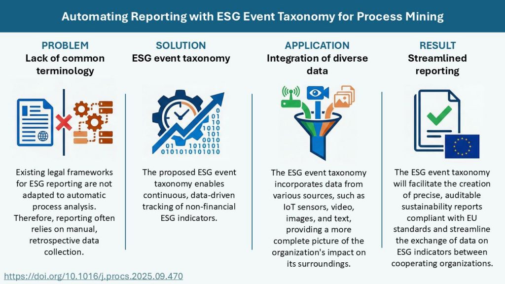 Dr. Elżbieta Lewańska and Dr. Milena Stróżyna presented the article “Enhancing ESG Reporting Through Process Mining: A Taxonomy of ESG Events” at the KES 2025 conference. This work, published as open access in Procedia Computer Science, proposes using process mining technology to automate the reporting processes of ESG indicators.